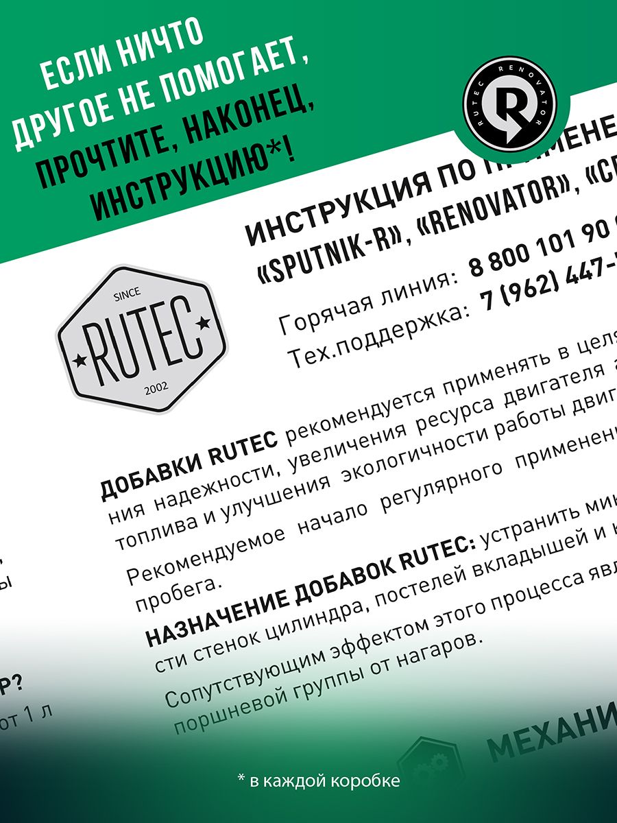 ВНИМАНИЕ! Не допускайте использование добавок RUTEC (в том числе и серии Renovator) с маслом, в состав которого входят присадки, формирующие устойчивые пленки на поверхностях деталей или забивающие места износа, например, дисульфид молибдена.