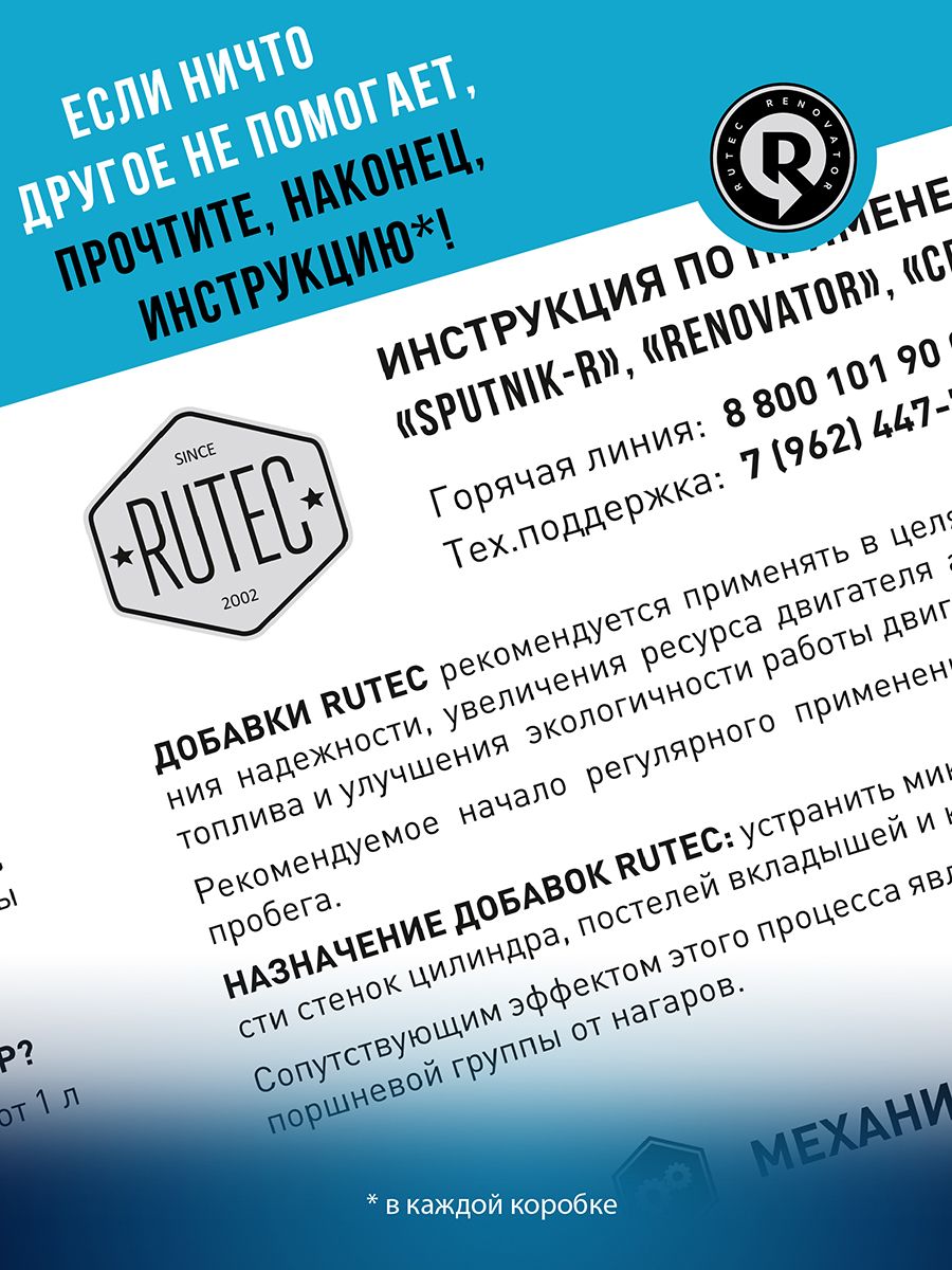 ВНИМАНИЕ! Не допускайте использование добавок RUTEC (в том числе и серии Renovator) с маслом, в состав которого входят присадки, формирующие устойчивые пленки на поверхностях деталей или забивающие места износа, например, дисульфид молибдена.